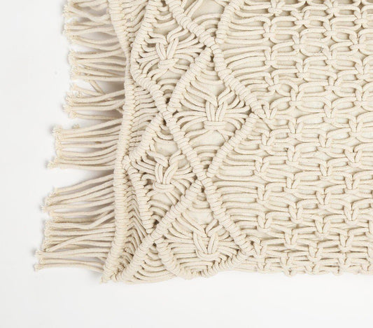 Poduszka w kształcie kwadratu z frędzlami z makramy | Węzeł diamentowy