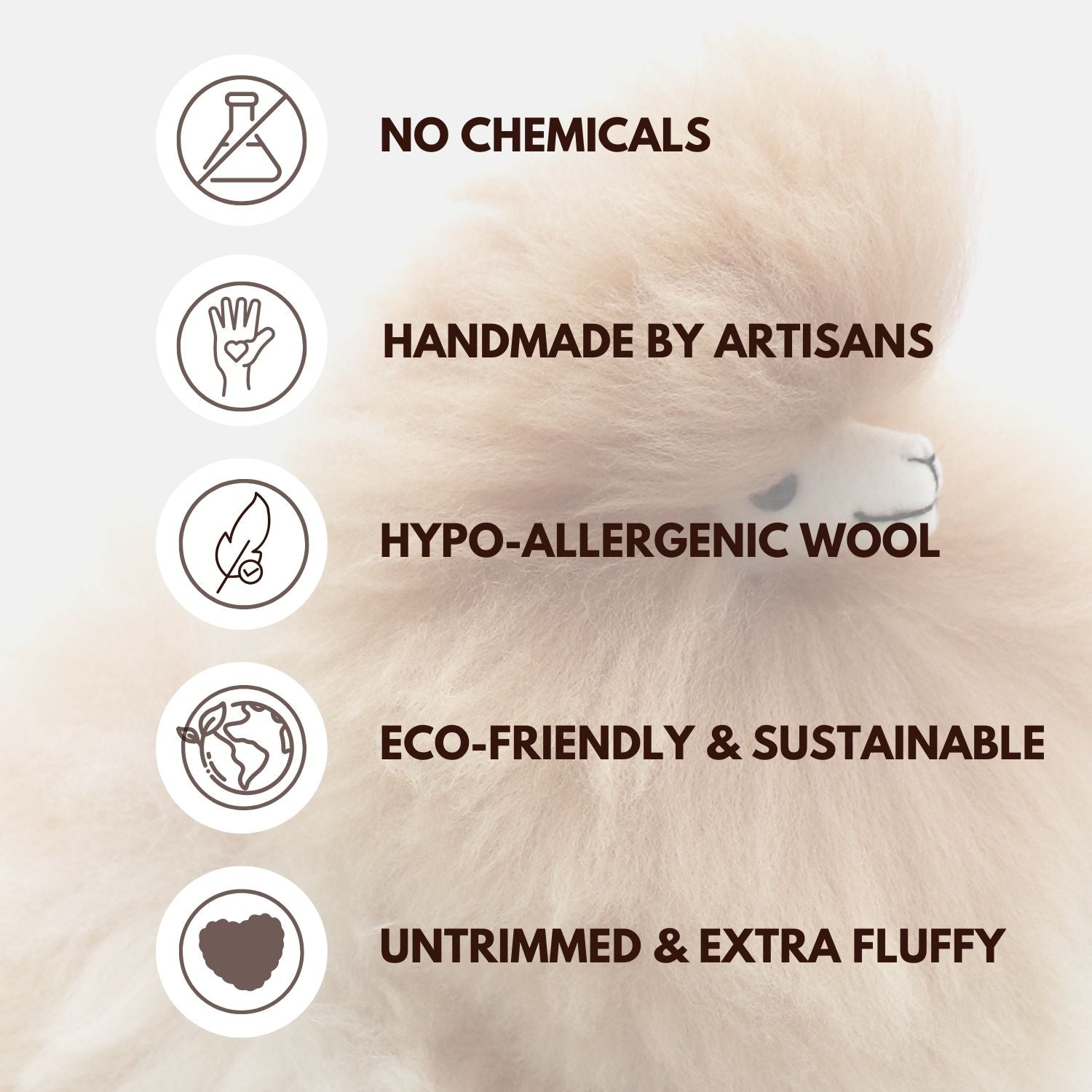 Najbardziej miękka, pluszowa zabawka, jaką kiedykolwiek spotkasz! Ręcznie wykonana z 100% naturalnej wełny alpaki z Wyżyn Peru. Jej luksusowy, miękki wygląd i dotyk zapewnią Ci nieskończoną dawkę ciepła i komfortu, podczas gdy jej słodka twarz i puszysta grzywa są nieodparte!