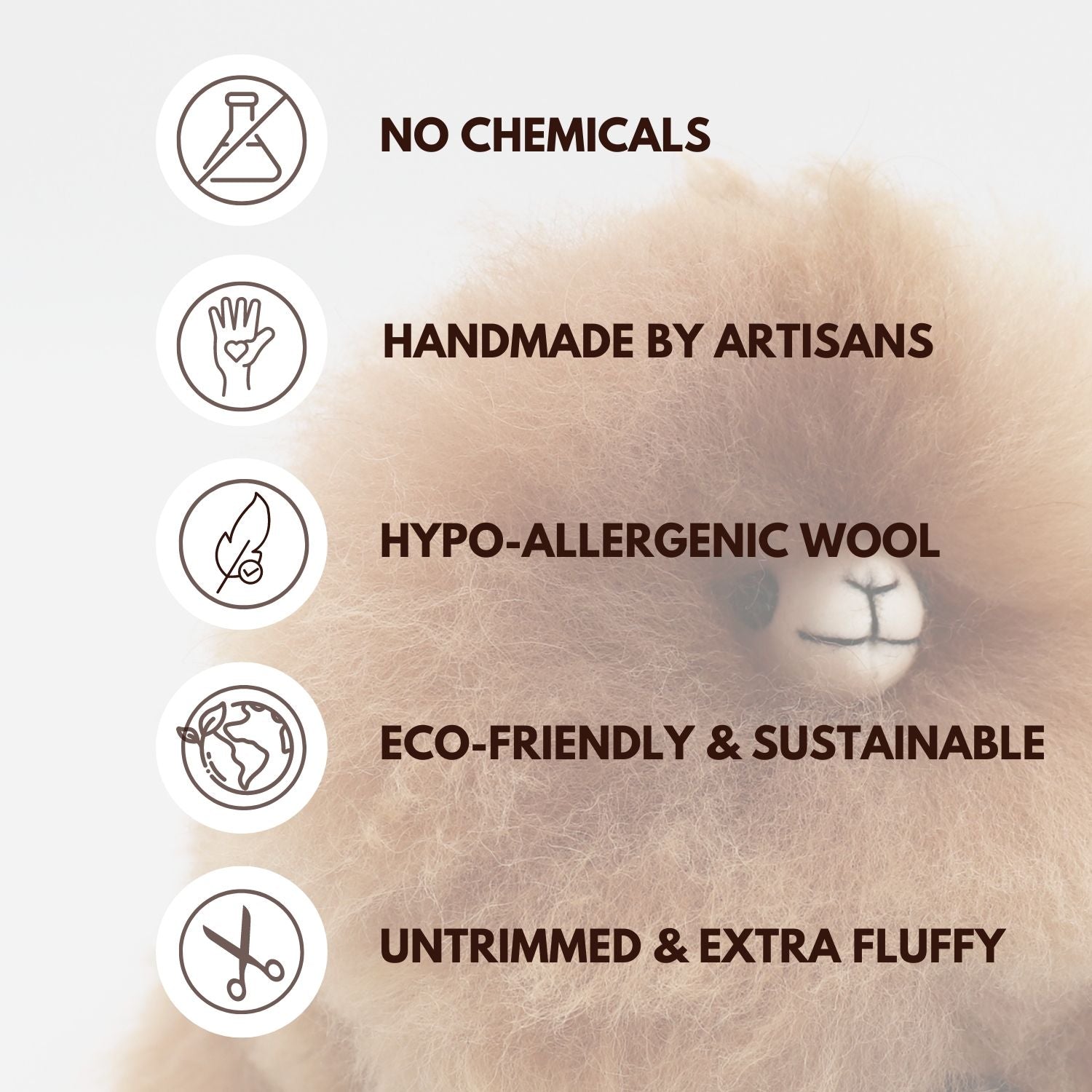 Najbardziej miękka, pluszowa zabawka, jaką kiedykolwiek spotkasz! Ręcznie wykonana z 100% naturalnej wełny alpaki z Wyżyn Peru. Jej luksusowy, miękki wygląd i dotyk zapewnią Ci nieskończoną dawkę ciepła i komfortu, podczas gdy jej słodka twarz i puszysta grzywa są nieodparte!